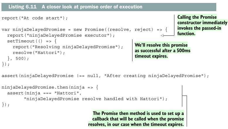 예제 코드는 "At code start"라는 메시지를 남기면서 시작한다. 그 다음 Promise 생성자를 호출하여 새로운 프로미스를 만든다. 이는 timeout을 설정한 이그제큐터 함수를 즉시 호출한다. timeout은 500ms 후에 프로미스를 해결(resolve)한다. 이후 아직 값을 갖고 있지 않으나 추후 갖게 될지 혹은 성공적으로 작업이 수행될지 모르는 ninjaDelayedPromise가 생성된다.(이는 timeout이 해결해주길 기다리고 있기 때문이다.) 생성을 끝마치고 나면 ninjaDelaytedPromise는 pending 상태에 들어간다.