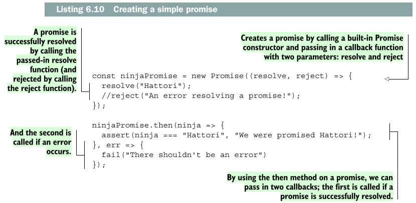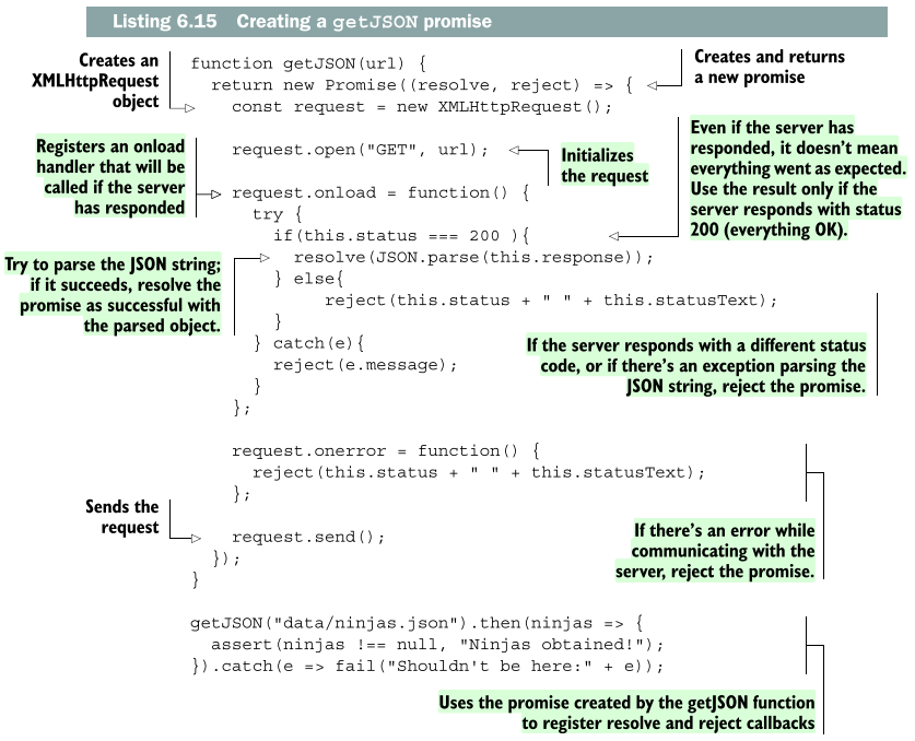 위 예제 코드의 목표는 getJSON 함수를 만드는 것이다. 이로써 서버로부터 비동기적으로 JSON 형식의 데이터를 받기 위한 성공(success)와 실패(failure) 콜백을 등록하게 해주는 프로미스를 반환한다. 근본적인 실행을 위해 내재된 XMLHttpRequest 객체를 사용하는데 이 객체는 두 가지 이벤트를 제공한다. 하나는 onload로서 브라우저가 서버로부터 응답(response)를 받았을 시 호출되며 다른 하나는 onerror로서 커뮤니케이션 생겼을 때 에러가 발생하면 호출된다. 이러한 이벤트 핸들러는 브라우저에 의해 비동기적으로 호출된다.