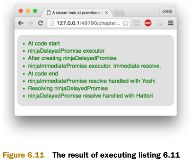 프로미스는 비동기적 동작을 다루기 위해 설계되어서 JavaScript 엔진은 항상 프로미스의 작동이 예측 가능하게 만들기 위해 비동기적 조작에 의존한다. 이벤트 루프의 현재 단계 안에 있는 모든 코드가 실행되고 나서 then 콜백을 실행함으로써 엔진은 이 같은 작업을 수행한다. 따라서 Figure 6.11의 결과값을 살펴 보면 'At code end'가 먼저 기록되고 나서 ninjaImmediatePromise가 해결되는 것을 볼 수 있다. 이윽고 500ms가 지나고 ninjaDelayedPromise가 해결되어 일치하는 then 콜백을 실행한다.