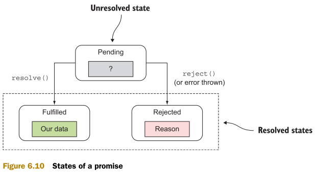 프로미스는 비동기적 과업의 결과를 위한 플레이스홀더이다. 프로미스는 아직 갖고 있지 않으나 앞으로 가질 것으로 예상되는 값을 나타낸다. 프로미스는 아래 그림에 나와 있듯 몇 가지 단계를 거쳐 작동한다.