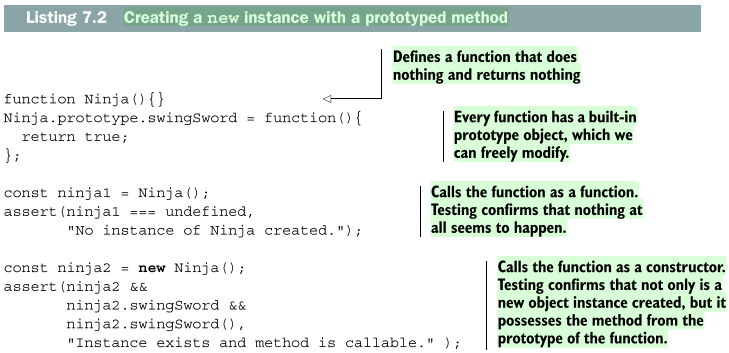 위 예제 코드에서 Ninja라는 아무 기능도 하지 않는 함수를 호출하는 방법에는 2가지가 있다. 하나는 const ninja1 = Ninja (); 라고 작성하여 일반적인 함수로 호출하는 방법이고 또 하나는 const ninja2 = new Ninja (); 라고 작성하여 생성자로 호출하는 방법이다.