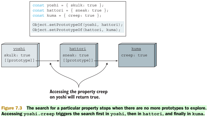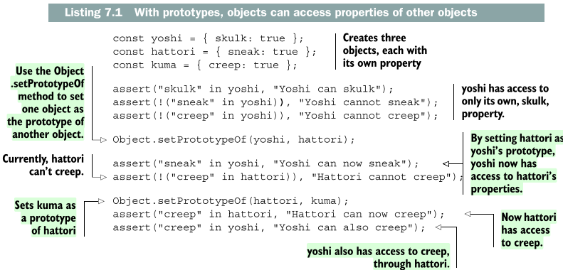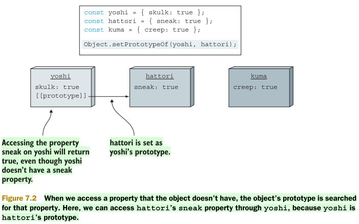 JavaScript에서 객체의 프로토타입 프로퍼티는 직접 접근할 수 없는 내재된 프로퍼티이다.([[prototype]]으로 적는다.) 대신 내장 메소드 Object.setPrototypeOf는 두 개의 객체 인수를 취하고 두 번째 객체를 첫 번째 객체의 프로토타입으로 설정한다. 예를 들어 Object.setPrototypeOf(yoshi, hattori)라고 작성하면 hattori를 yoshi의 프로토타입으로 설정한다는 뜻이다.