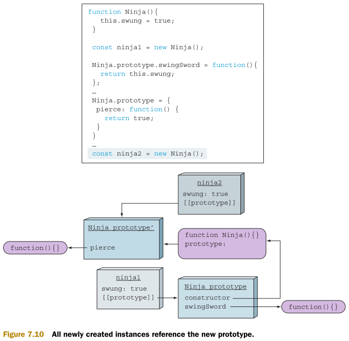객체와 함수의 프로토타입 간 참조는 객체가 인스턴스화될 때 설정된다. 새롭게 만들어진 객체는 새 프로토타입에 대한 참조를 가질 것이며 pierce 메소드에 대한 접근 역시 가진다. 반면 변경되기 이전의 프로토타입 객체는 원래 프로토타입을 유지해서 swingSword 메소드에 접근 가능하다.