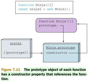 함수를 생성자로 사용할 때(예를 들어 new Ninja ()를 호출하는 경우처럼) 새롭게 생성된 객체의 프로토타입은 생성자 함수의 프로퍼티에 의해 참조되는 객체로 설정된다.