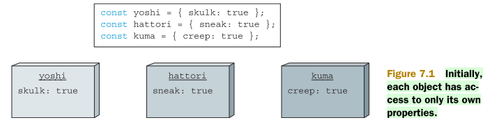 위 예제에서 우선 'yoshi', 'hattori', 'kuma'라는 객체 3가지를 생성하고 시작한다. 각 객체에는 해당 객체에만 접근할 수 있는 하나의 특정 프로퍼티가 있다. yoshi는 skulk, hattori는 sneak, kuma는 creep이다.