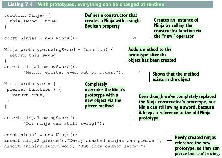 위 예제에서도 역시 Ninja 생성자를 정의하여 객체 인스턴스를 만드는 데 사용하였다. 인스턴스가 만들어지고 난 후 프로토타입에 swingSword 메소드를 추가한다. 그런 다음 테스트를 실행하여 객체가 생성된 후 프로토타입에 대한 변경 사항이 적용되는지 확인한다.