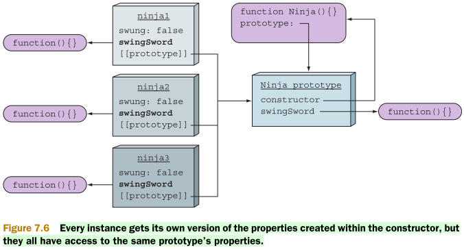 그림을 보면 알 수 있듯 모든 ninja 인스턴스는 각자 생성자 내에서 만들어진 고유한 프로퍼티를 가져오지만 모두 동일한 프로토타입 프로퍼티에 접근할 수 있다. 이는 각 객체 인스턴스에 특정한 값 속성(swung)에 대해 문제가 없다. 하지만 몇몇 경우 메소드에 대해서는 문제를 일으킬 소지가 있다.
